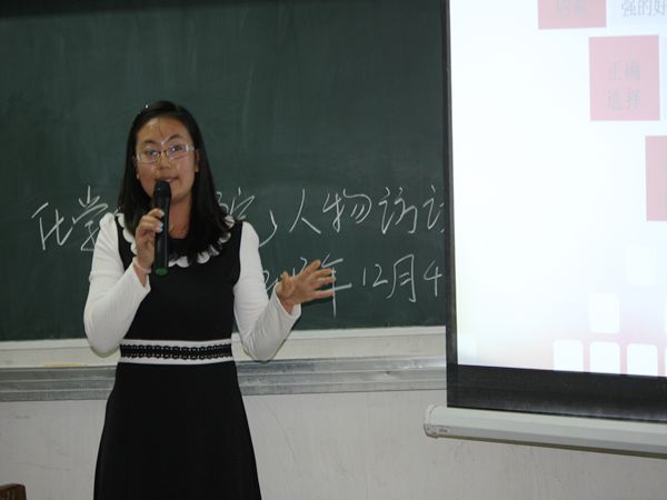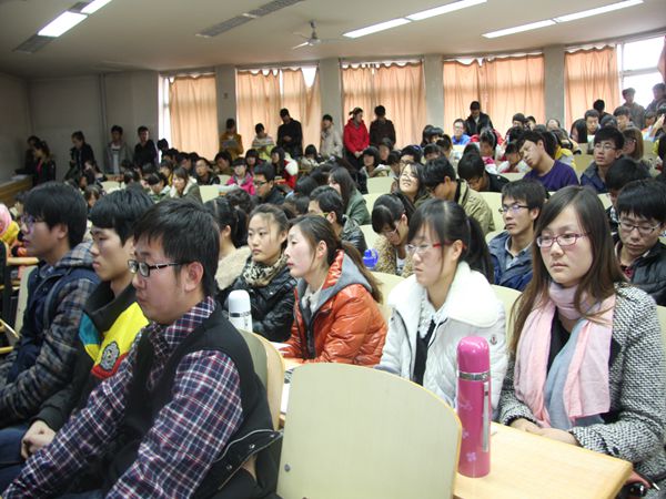 2012级研究生黄浩。院分党委副书记潘瑞、12号公寓党支部书记曹洋、辅导员王艳梅与学院近300名本科生、研究生旁听了此次活动。