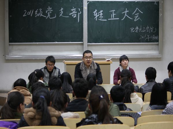 2011级学生党支部预备党员转正大会。2011级党支部共有党员32名,其中正式党员5名,预备党员27名。
