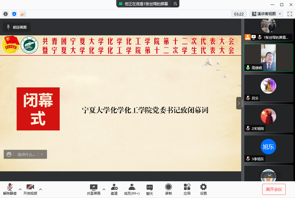 大会结束之际,海舍舍同学作为第十二届学生委员会委员代表宣读倡议书,呼吁新一届团委学生会成员不忘跟党初心,牢记青春使命。学院党委书记高继明致闭幕词,高书记代表学院党委、行政对大会的胜利召开表示热烈的祝贺!对学院团学组织今后的提出了三点希望:一要坚定理想信念,坚持立德树人,团结引领同学;二要加强理论学习,提高整体素质,增强服务本领;三要聚焦主责主业,认真履职尽责,全力服务同学。高书记在最后讲话中强调:未来属于青年,希望寄予青年。作为新时代的中国青年,我们要以实现中华民族伟大复兴为己任,增强做中国人的志气、骨气、底气,不负时代,不负韶华,不负党和人民的殷切期望!让我们在深化党史学习教育中,坚定不移感党恩、听党话、跟党走,增强“四个意识”、坚定“四个自信”,做到“两个维护”,团结一致,拼搏进取,引领学院团委学生会工作迈上新的台阶,用实际行动践行“请党放心,强国有我”的铮铮誓言,用我们的青春、汗水奋力谱写新时代的华彩乐章,为建设西部一流大学贡献青春、智慧和力量!