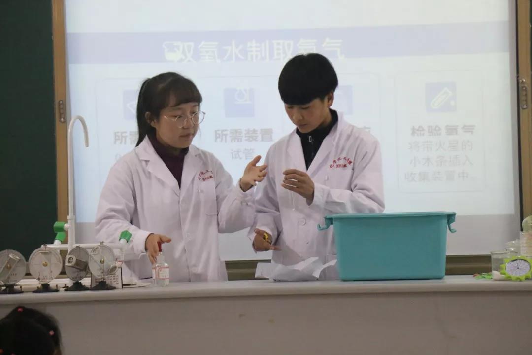 本次活动志愿者为小学生们做的第一个实验是“过氧化氢与二氧化锰制氧气并用带火星的小木条检验氧气”。在实验过程中,小朋友们看到将带火星的木条放到制备好的氧气中可以使木条复燃,感叹实验神奇之余也纷纷向志愿者们询问了原理。