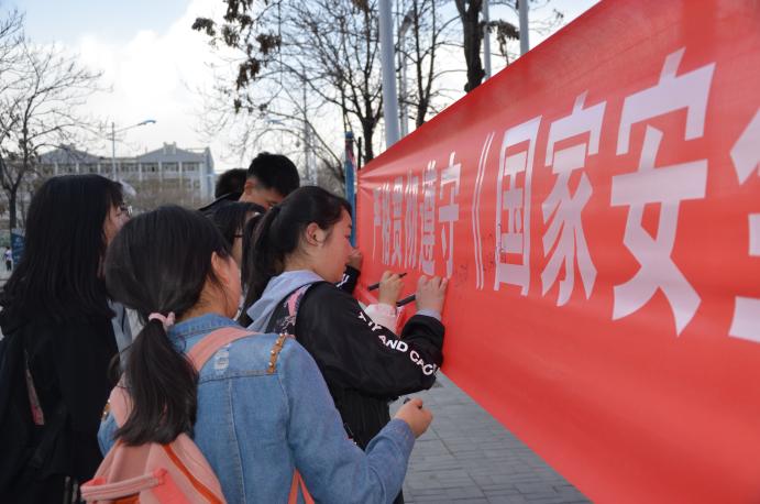 活动现场,过往的学生从志愿者手中接过维护国家安全的宣传材料和倡议书,仔细阅读了解,并排队在印有“加强国家安全教育,增强国家安全意识”的条幅上签下了自己的名字。
