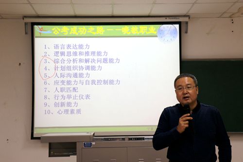 陈老师主要从考察热点、考察重点和应试技巧等三个方面为在场学生进行了全面讲解。在考察热点的问题上,陈老师以“双11”和“转基因食品”为例,使大家对考察热点有了进一步了解。对于考察重点和应试技巧的问题,陈老师通过对语言表达、逻辑思维与推理、综合分析和解决问题、计划组织协调等十种能力的分析,为大家详细讲述了公务员考试所考察的重点内容和通过考试所应具备的能力技巧。此外,陈老师强调了公务员考试中审题的重要性,他说:“审对题,事半功倍:审错题,功亏一篑”。陈老师还结合往年真题,对今年的考试进行了预测和分析,并就面试技巧、面试礼仪等为同学们进行了现场指导。