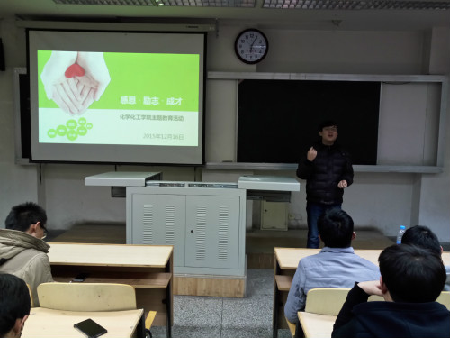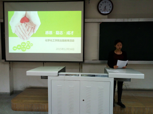 化工学院于12月16日下午5:00,在文萃校区一教122教室举行“感恩励志成才”主题实践教育总结大会。学院党委副书记潘瑞、辅导员、2014—2015年奖助学金获奖代表及200多名受资助学生参加了活动。