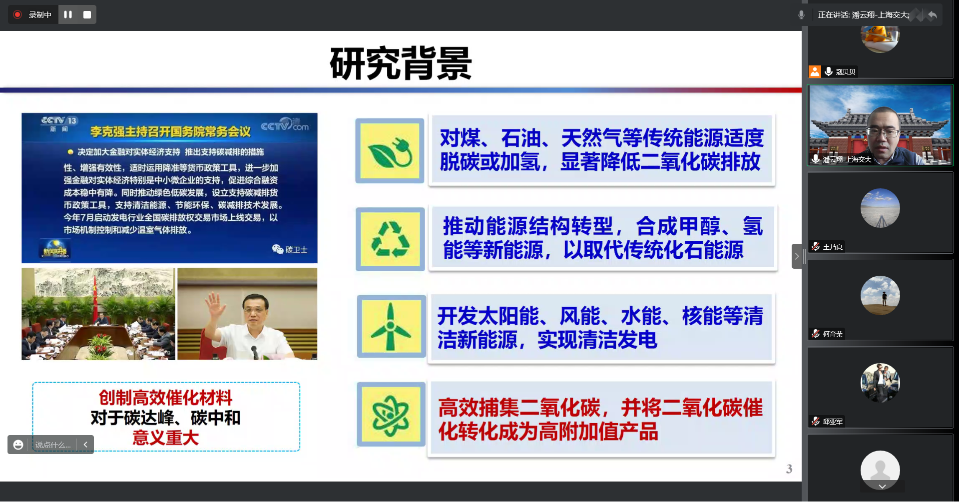 潘云翔教授以“非贵金属催化剂的低温构建及其催化CO2转化机制”为题作了报告,介绍了利用新型等离子体装置对催化材料进行低温精准合成,并应用于CO2吸附和转换。重点介绍了通过在催化材料引入缺陷位、官能团等提高CO2转换率的方法。