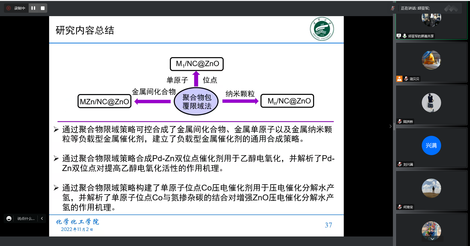 邱亚军博士以“聚合物限域构建负载型金属催化剂及其催化性能研究”为题作了报告,主要介绍了不同金属组分的负载型金属催化剂的可控合成,并解析了不同金属组分的负载型金属金属催化剂在乙醇电氧化和压电催化分解水产氢反应中的作用机理和构效关系,为负载型金属催化剂的开发提供新的思路。