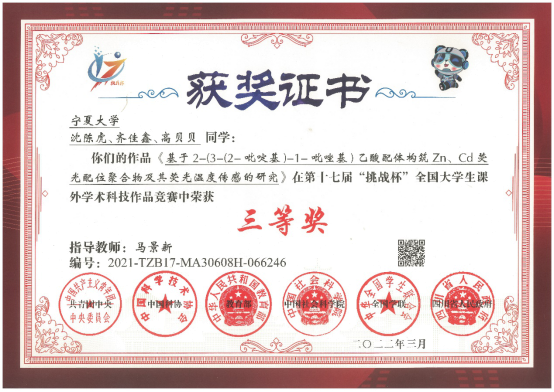 分析专业2017级本科生沈成虎(已保研至中科院福建物构所)、2020级本科生齐佳鑫、高贝贝完成的题为:“基于2-(3-(吡啶-2-基)-1H-吡唑-1-基)乙酸配体构筑Zn、Cd荧光配位聚合物及其荧光温度传感的研究”的作品荣获全国三等奖,马景新副教授为该作品指导教师。