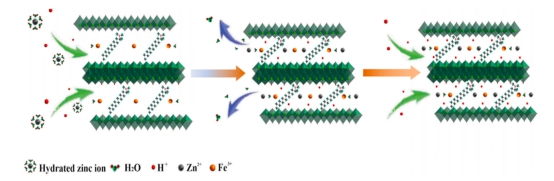 水系锌离子电池具有安全性高、成本低等优点,是一种很有前途的储能器件。然而由于适合锌离子脱嵌的正极材料有限,它们的研究仍处于起步阶段。快速的离子扩散通道和稳定的晶体结构稳定性对于水系锌离子电池正极材料非常重要。本工作首次采用铁离子与烷基季铵离子共插层策略改性V2O5型钒氧化物。通过水热反应和离子交换反应合成了铁离子与烷基季铵阳离子共插层的钒氧化物(FeVO-12)。通过铁离子与带负电的VOx层板间的静电吸引稳定层结构;烷基季铵阳离子扩大层间距,高达19.26 Å的层间距为Zn2+的脱嵌提供了便利的通道。同时,烷基季铵阳离子还增加了活性材料的表面疏水性,抑制FeVO-12在水系电解液中的溶解。FeVO-12作为锌离子电池正极材料,展现出了优异的电化学性能:电流密度100 mA g-1时,达到了408 mAh g-1的比容量;电流密度5 A g-1时,比容量保持在228 mAh g-1,同时在此电流密度下1000圈循环后放电比容量保持率90%。通过对储锌机制的探究,发现放电过程中Zny(OTf)y(OH) 2x-ynH2O的出现,证明了H+/Zn2+双离子共嵌入机制的共嵌入机制。这种共插层策略为开发稳定高效的钒氧化物正极材料提供了优化设计方向。