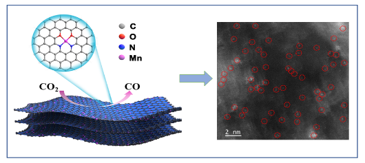 彭娟副教授团队长期致力于电催化制备氢能源及CO2转化制备高附加值化学品和燃料的研究工作。本工作中,该团队成功地合成了一种具有Mn-N2O2高活性位点的低Mn含量单原子催化剂。该单原子Mn催化剂对CO2还原反应表现出高效的电催化性能。在0.5 M KHCO3电解液中,使用H型电解槽,在−0.460 V(V vs. RHE)下的最大CO法拉第效率(FE)达到 96.0%。X射线吸收光谱(XAS)和DFT计算表明,Mn-N2O2位点促进CO2的吸附并显著降低中间体*COOH形成的自由能垒。嵌入碳纳米片中的Mn单原子具有N、O双重原子配位的存在显著提高了CO2还原的电催化活性。因此,可以通过调节配位环境来提高单原子金属催化剂的催化性能。