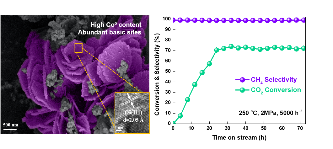 “煤基应用催化”科技创新团队由赵天生教授担任学术带头人,长期致力于CO/CO2催化转化研究,在环境友好多相催化剂设计制备方面具有较为丰富的经验。本工作中,该团队设计了一种高效稳定的层状Co-Al-O催化剂,在较低温250 ℃条件下,CO2单程转化率达到74%,CH4选择性接近100%,是目前报道低温条件下活性最高的Co基催化剂之一。对CO2加氢转化的反应路径研究表明,独特的层状结构可使催化剂在高负载量的同时保持高分散,暴露更多的Co(111)晶面;通过改变催化剂制备过程活化条件,精准调控表面金属物种浓度和碱度,促进了反应物分子的低温吸附活化;活化后的CO2与解离后的H原子发生反应,经碳酸盐/甲酸盐中间体,高选择性生成甲烷。该研究发现拓展了CO2加氢催化剂的设计思路。