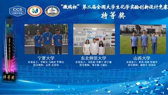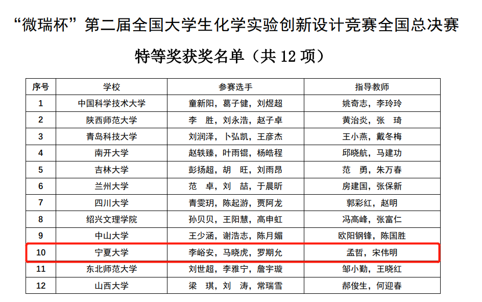 师生组成的我校代表队(指导教师:孟哲、宋伟明,参赛学生:李峪安、马晓虎、罗期允),获得西北赛区一等奖,成为宁夏高校唯一代表入围全国总决赛。总决赛中,我校团队奋勇拼搏,同来自中国科学技术大学、浙江大学、同济大学在内的90支代表队展开激烈角逐,荣获特等奖。这是我校化学一流本科专业建设中取得的重要成绩,也是我校不断强化立德树人,全面提高人才培养质量的又一硕果。