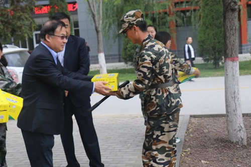训练场上,马玉龙书记向新生辅导员详细询问了训练情况并发表了简短的讲话。对于新生在军训中体现出的不怕苦,不怕累的精神,马玉龙书记予以充分肯定并对全体新生提出了两点要求:希望新生能够遵守纪律、服从指挥,凝聚成团结的集体;希望做到劳而不怨、精益求精,在汇报表演时展现出化院人的精神风貌。马玉龙书记还从学院师资力量、学科设置、专业特点等方面做了初步介绍,鼓励新生奋发图强,勇于争优。最后,学院领导、老师们为新生发放慰问品。