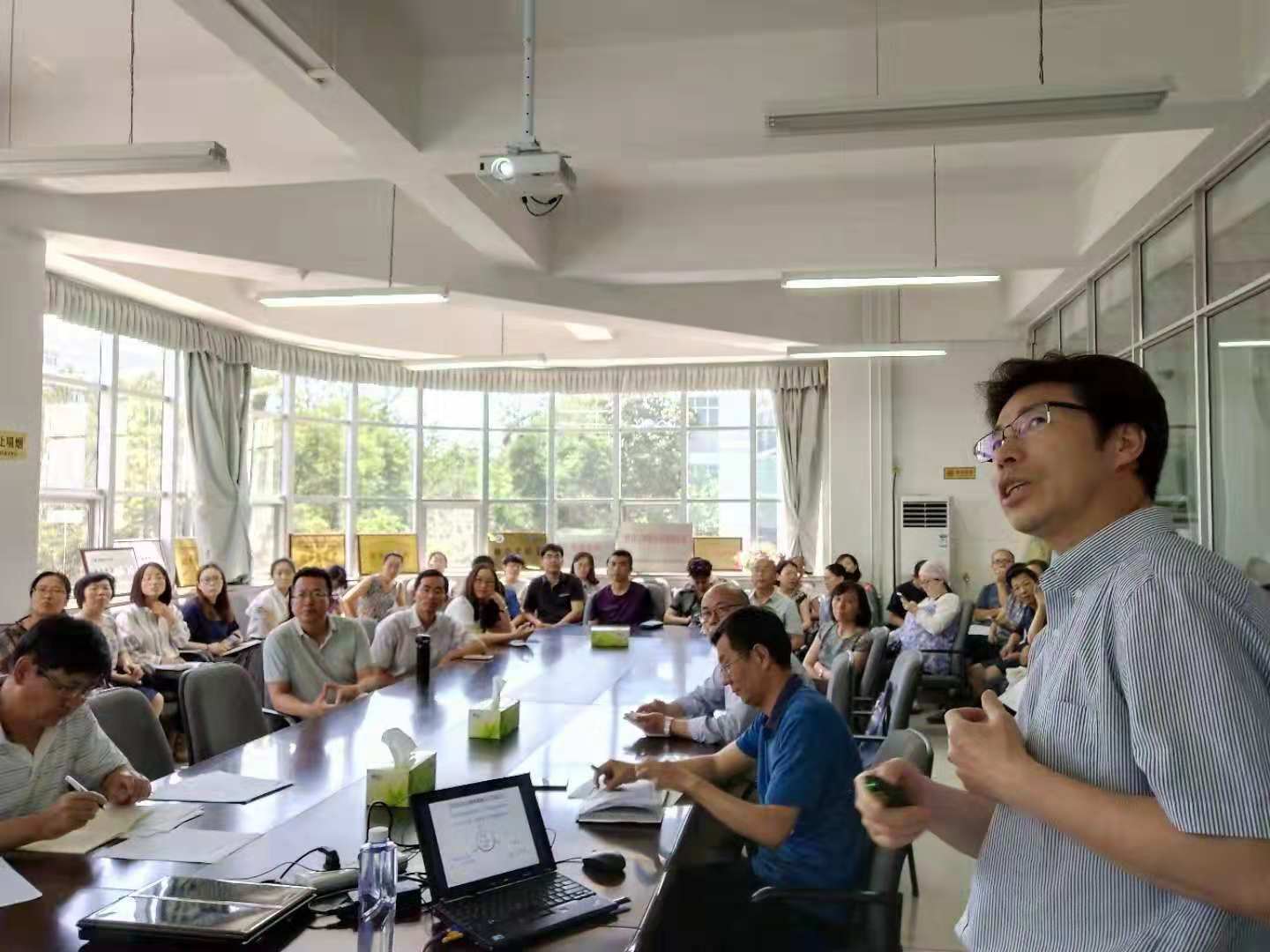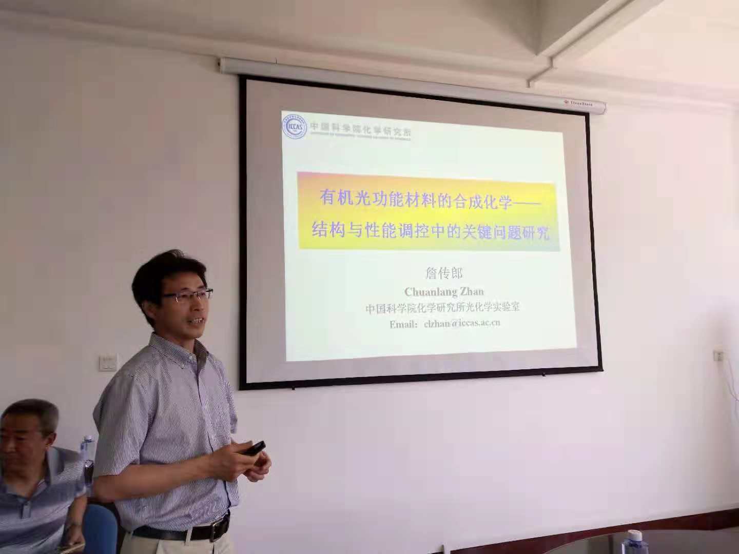2018年7月11日,为促进蘑菇视频 一流学科的发展与“化学”硕士学位点的建设,学院邀请中国科学院化学所詹传郎教授来蘑菇视频 进行学术交流。双方就学院“化学”学科的发展进行交流,詹教授对蘑菇视频 “化学”学位点的自评估工作提出了一些很好的建议。当天下午,詹教授还为学院全体研究生导师做了一场“有机光功能材料的合成化学——结构与性能调控中的关键问题研究”学术报告。