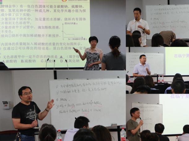 浙派名师初中科学班学员、永康市第五中学吴慧萍老师为师范生展示《培养解题反思习惯――促进知识主动迁移》教学。吴老师展示了一道得分率较低的2018年浙江省金华市初中科学中考试题化学推断题,通过学生解答、黑板展示、错因分析、自我反思,通过变式训练、模型建立,使学生明白在化学学习中要注重原理、理由、条理等三个方面,加强理性思考、深化课堂改革、发展学生核心素养。课后,学生与名师班学员就化学核心素养提升、课堂激励性评价、如何应对课堂生成性问题等话题进行了深度交流,引发了学生深入的思考。