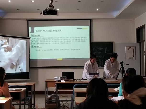 第二阶段是在研究生马英同学的辅助下,成功地向同学们演示用氧气传感器探究催化剂表面积对过氧化氢分解速率的影响、用温度传感器探究不同物质的溶解热效应、用气体压力传感器探究镁与稀盐酸反应的反应速率、用导电率传感器电解质的导电情况、用pH传感器和导电率传感器强弱电解质这五个利用手持技术的实验,其实验现象明显、效果显著,引起了同学们的广泛兴趣。