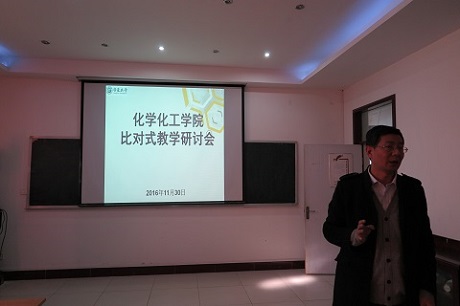 教师教学能力的提升,促进教师专业成长,促进学院教学质量的提高,通过将现场教学实践与教学示范互相融合,通过传帮带、教学方法研讨等多种方式为教师之间的交流教学提供良好平台。根据教务处期中教学检查安排及学校教师教学发展研究中心《关于联合举办“比对式教学”专题研讨会的通知》要求,学院于11月30日下午2点在化学楼303室举办“比对式教学”研讨会暨教学观摩活动。研讨会由倪刚副院长主持,院长刘万毅教授、学院督导蔡超教授、吴晓红教授、高作宁教授担任研讨会的点评专家,全院任课教师参与学习、研讨和交流。