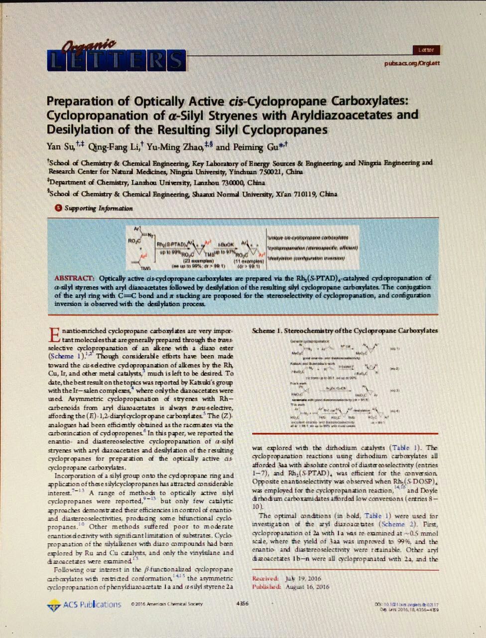教师苏艳博士、顾培明教授合作开展的手性环丙烷酯的制备研究最近取得了重要进展。手性环丙烷酯在有机合成化学中表现出很独特的反应性能,在药物化学中也有十分广泛的用途。通常情况下,反式环丙烷酯很容易制备,但目前顺式环丙烷酯难以通过常规方法获得。课题组使用硅基作为临时占位基团,在进行不对称环丙烷化反应后再脱除硅基,高效获得了高光学活性的顺式环丙烷酯。相关研究成果“Preparation of Optically Active cis-Cyclopropane Carboxylates:Cyclopropanation of α-Silyl Stryenes with Aryldiazoacetates andDesilylation of the Resulting Silyl Cyclopropanes”,发表于具有重要学术影响力的Nature指数期刊“Organic Letters”(影响因子6.732)[Org. Lett.2016, 18, 4356−4359 ]。
