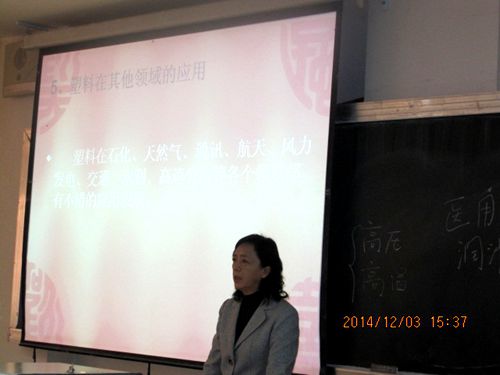 鲁忠瑛高级工程师是自治区313人才,自治区跨世纪学术、技术带头人,中国塑料加工工业协会专家委员会专家,讲座中,鲁总工分别从高分子材料与生活、制造业对高分子材料的需求、高分子专业的就业与专业选择、高分子专业历史沿革、塑料的应用领域、资源化利用、材料设计与技术革新等方面做了深入的阐述,并就学生感兴趣的毕业招聘、材料的安全使用等问题做了解答,报告会现场气氛热烈。