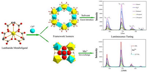 该项目最近取得阶段性进展,成功合成出两个系列的新型微孔d-f 金属— 有机框架物。单晶X-ray研究发现这两类化合物在晶体学上属于罕见的框架异构体!荧光研究表明化合物(1b)和(2b)具有发光强度大,量子产率高,荧光寿命产等优点。更重要的是(1b)和(2b)的发光性能可以分别被亲水性有机小分子和无机金属离子有效调节(见上图)。