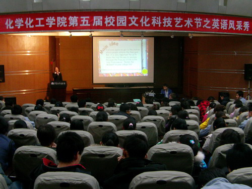 团委主办,社团实践部和组织部承办的第五届校园文化科技艺术节之英语风采秀在校B区图书馆报告厅拉开帷幕。活动的初赛和复赛围绕“show me show my life”的主题,以演讲为展示主线,才艺穿插其中。经过激烈角逐,有10名同学从参赛的50多名同学中脱颖而出,进入决赛。