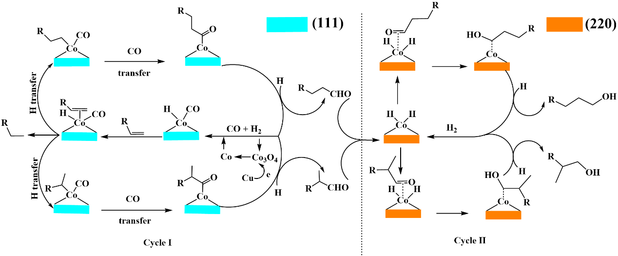 工业高碳醇制备主要采用分立的氢甲酰化和加氢两步反应将原料α-烯烃转化为高碳醇。该研究采用Fe-Cu共同修饰的Co3O4基催化剂可一步将C6~C12α-烯烃转化为C7~C13醇,如1-辛烯转化率为99%,1-壬醇选择性67.87%,1-壬醛选择性18.35%。研究发现,Cu修饰可通过促进反应条件下Co3O4原位还原及acyl-Co(CO)x-1中间体的形成提高反应活性,而Fe-Cu共修饰可调控醇产物选择性。催化剂前体的主暴露Co3O4(111)和(220)晶面分别关联氢甲酰化和加氢连续反应步骤(图1)。这一结果为煤制油α-烯烃初级产物下游加工高效催化剂开发提供了新线索。
