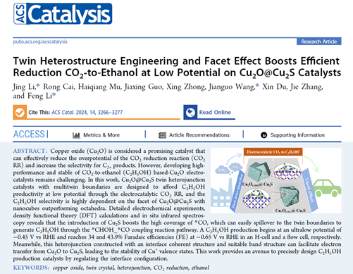 李丰/李晶博士在电催化CO2还原制乙醇催化剂设计及机理研究方面取得重要研究进展。该工作以“Twin Heterostructure Engineering and Facet Effect Boosts Efficient Reduction CO2-to-Ethanol at Low Potential on Cu2O@Cu2S Catalysts”为题发表在催化领域国际顶级期刊《ACS Catalysis》(IF = 12.9,中国科学院一区TOP),并被研之成理、邃曈科学云等公众号平台转载报道。该论文第一作者为李晶博士,李丰博士和浙江工业大学王建国教授为共同通讯作者,蘑菇视频