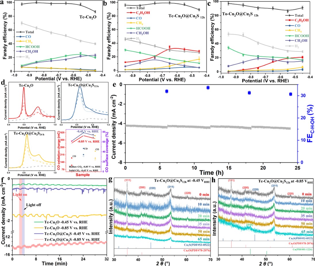 CO2分子具有很高的热力学稳定性(C=O键解离能高达750 kJ·mol-1),将其在温和条件下化学转化是一项极具挑战性的研究课题。研究团队通过Cu2O晶面控制及异质结构筑策略合成了Cu2O@Cu2S孪晶(立方体Tc-Cu2O@Cu2S,八面体To-Cu2O@Cu2S)催化剂。详细研究了晶面,异质结,及孪晶晶界对CO2还原选择性的影响。原位XRD及原位光电流测试技术详细揭示了异质结构建对Cu+的稳定作用。原位红外及理论计算结果揭示了催化剂表面CO2制乙醇过程反应机理。在−0.65 V vs RHE电位下,乙醇在H型电解池和流动池中的法拉第效率分别达到34%和43.9%,并在160 mA cm-2电流密度下催化剂保持较好的稳定性。