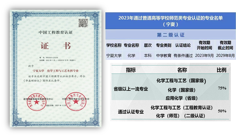学院拥有1个二级学科博士学位点,2个一级学科硕士学位点,1个工程硕士学位点和1个学科教学专业硕士学位点。设有化学工程与工艺、应用化学、制药工程、材料化学、化学(师范、分析与检测)五个本科专业,其中由于学科及专业调整材料化学专业于2022年停止招生,2024年学院积极配合学校综合改革及“四定”工作,进一步整合优化专业配置,目前化学工程与工艺(含卓越工程师班)1个工科专业和化学(师范、分析与检测、基础拔尖人才培养)1个理科专业进行招生,且两专业均入选国家级一流专业建设点及自治区级“六卓越一拔尖”计划2.0建设计划,“化学工程与工艺专业群”为自治区“十三五”重点建设专业(群),化学工程与工艺是宁夏回族自治区目前唯一一个通过工程教育专业认证的工程专业,化学(师范)通过师范专业认证。