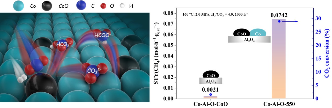 CO2甲烷化是典型的放热、低温有利的反应,但低温下反应受动力学限制,研发性能优异的低温CO2甲烷化催化剂一直是一个挑战。研究团队通过调控CoAlO催化剂中不同Co物种比例,实现了低温高效转化,研究并揭示了催化活性与Co物种的构效关系与反应路径。在160⁰C下,CO2转化率达29.0%,甲烷空时产率达0.0742 molCH4·h−1·gcat−1,具有优异的低温CO2甲烷化性能。