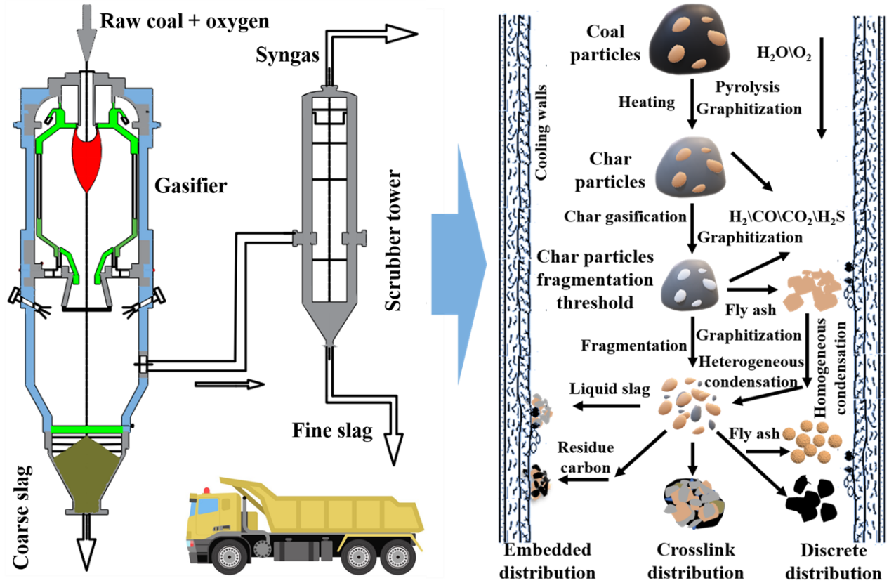 该工作旨在研究工业气流床气化炉产生的煤气化细渣的理化特性、碳灰赋存模式及其形成机理,从而揭示原煤颗粒在气化炉内的反应历程。研究表明,煤颗粒在气化过程中经历了固定碳燃烧、外在矿物质转化、煤焦颗粒破碎以及内在矿物质释放等一系列的关键阶段,这些阶段导致气化细渣中碳灰组分的嵌入分布、交联分布和离散分布赋存模式。离散分布模式形成主要是由于粒度较小的煤颗粒因停留时间较短未能完全参与反应,从而在低温区域形成了碳灰颗粒。交联分布模式主要源于原煤颗粒因反应活性不同而达到的反应程度不同所形成的碳灰颗粒。嵌入分布模式是由于在反应过程中熔融的无机组分将高碳含量颗粒进行包裹,从而形成的特定碳灰赋存结构。揭示炉内原煤颗粒的反应历程有助于在实际生产操作中实现精准反馈调控,进一步减少资源浪费并提高运行效率。