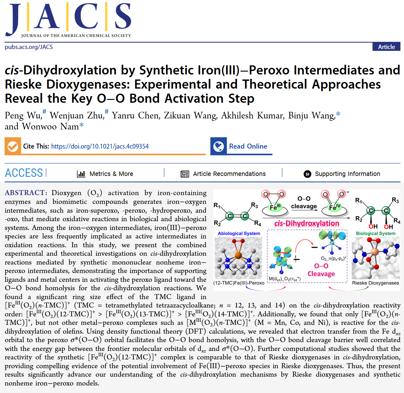 吴鹏博士与厦门大学、梨花女子大学合作在化学领域顶级期刊Journal of the American Chemical Society上发表了题为“cis-Dihydroxylation by Synthetic Iron(III)–PeroxoIntermediates andRieskeDioxygenases: Experimental and Theoretical Approaches Reveal the Key O–O Bond Activation Step”的研究论文。论文第一作者为吴鹏博士,通讯作者为厦门大学王斌举教授和梨花女子大学WonwooNam教授,蘑菇视频