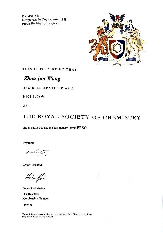 王周君教授入选英国皇家化学会会士(Fellow of the Royal Society of Chemistry, FRSC)。