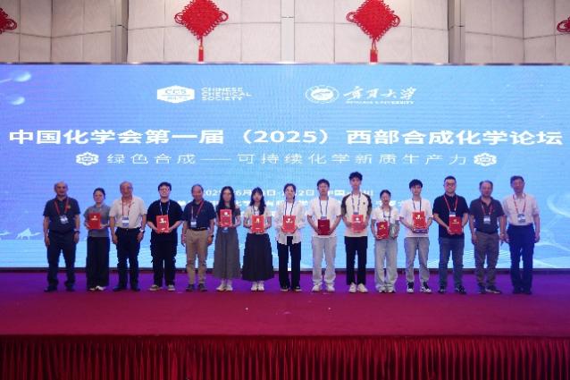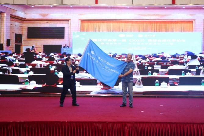 、贵州大学、南开大学、复旦大学、四川大学和香港浸会大学的青年学者荣获奖项,并现场获颁荣誉证书及奖品。闭幕式上,会议正式宣布第二届(2027)西部合成化学论坛将由新疆师范大学承办,并进行了会旗交接仪式。