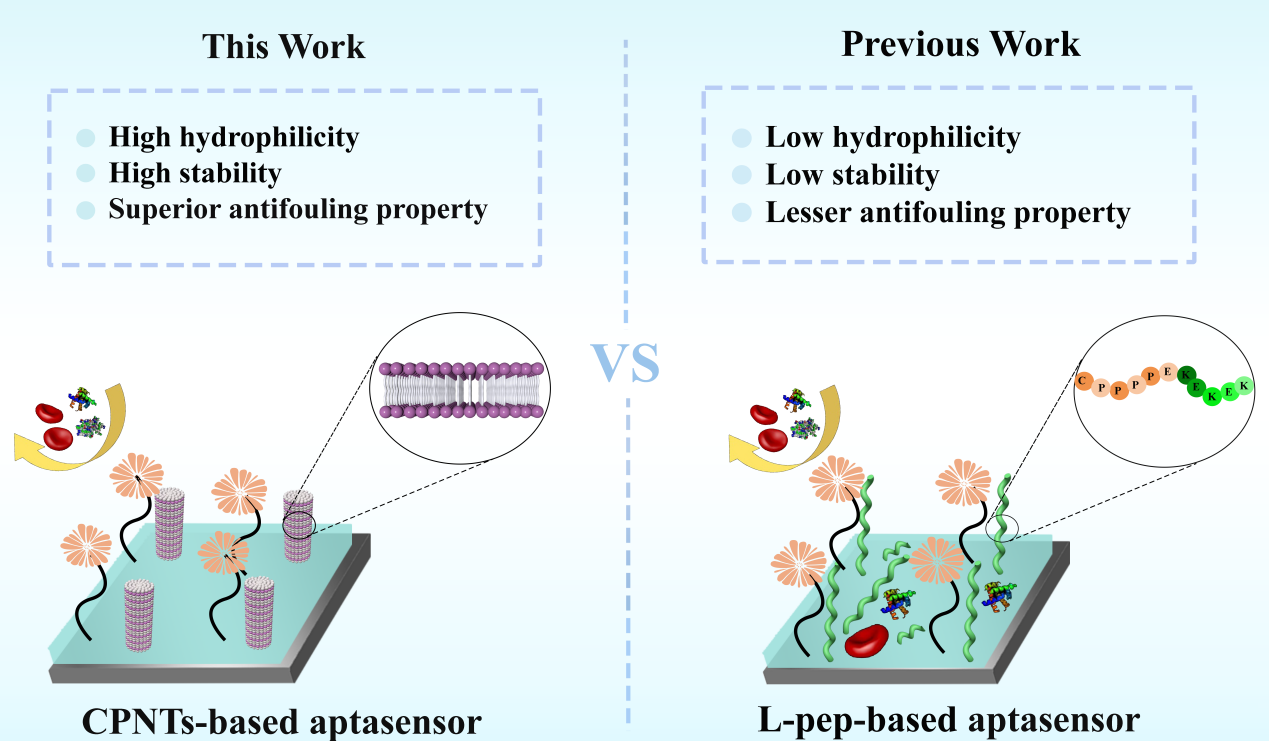 本研究针对天然线性肽易受酶降解而限制其长期应用的关键问题,创新性地提出了一种基于环肽纳米管的新型抗污生物传感器,用于复杂生物样本中癌症抗原125(CA125)的高灵敏检测。通过环肽自组装策略制备的环肽纳米管(CPNTs),凭借其分子内氢键和刚性管状结构展现出优异的稳定性。同时,纳米管表面密集排列的亲水残基(如丝氨酸、组氨酸和谷氨酸)通过与游离水分子的氢键形成动态水合层,使其抗污性能相较于线性肽提升2.7倍。最终,将CPNTs优异的抗污性能与Rh-Ti3C2TX纳米酶的级联催化放大相结合,所构建的抗污生物传感器实现了对人血清中CA125的高性能检测,检测限低至0.005U·mL-1。该工作为合理设计高效抗污材料提供了新思路,也展示了人血清中卵巢癌标志物检测的临床应用潜力。