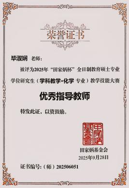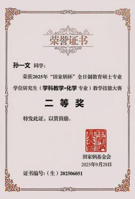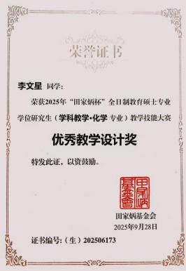 学子表现优异,载誉而归。其中2024级学科教学(化学)专业硕士研究生孙一文荣获二等奖,李文星、李道燃荣获“优秀教学设计奖”,毕淑娴老师被评为“优秀指导教师”。