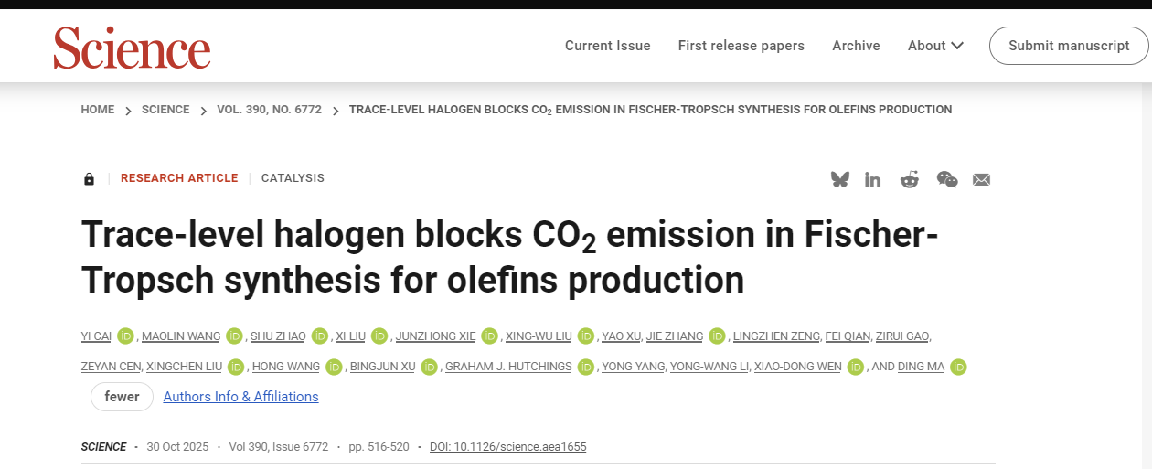 2025年10月30日,该成果以"Trace-level halogen blocks CO2emission in Fischer-Tropsch synthesis for olefins production"为题发表在《Science》期刊上,蘑菇视频