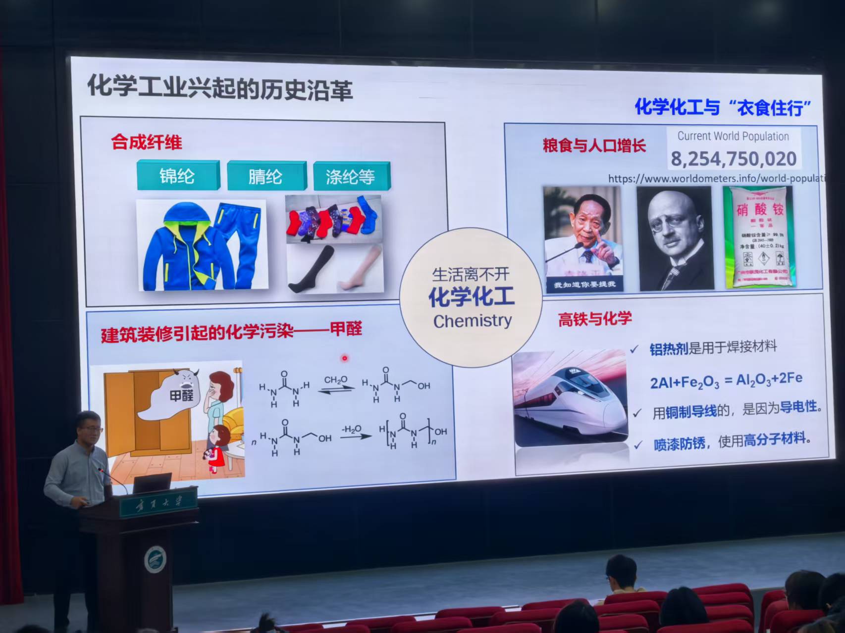 高洪银教授介绍了化学化工的重要性及推动我国化工产业高质量发展面临的挑战与机遇,并且深入浅出地介绍了课题组围绕“如何实现温和条件下精准可控的重排反应”这一核心科学问题,通过系统研究发展了一系列官能团化芳胺、吲哚、联苯及肼类化合物的新颖合成方法。最后,他结合自己的成长经历和科研历程激励同学们要懂得感恩、坚持和担当,只有在科研过程中“耐得住寂寞”,才能守得云开见月明。