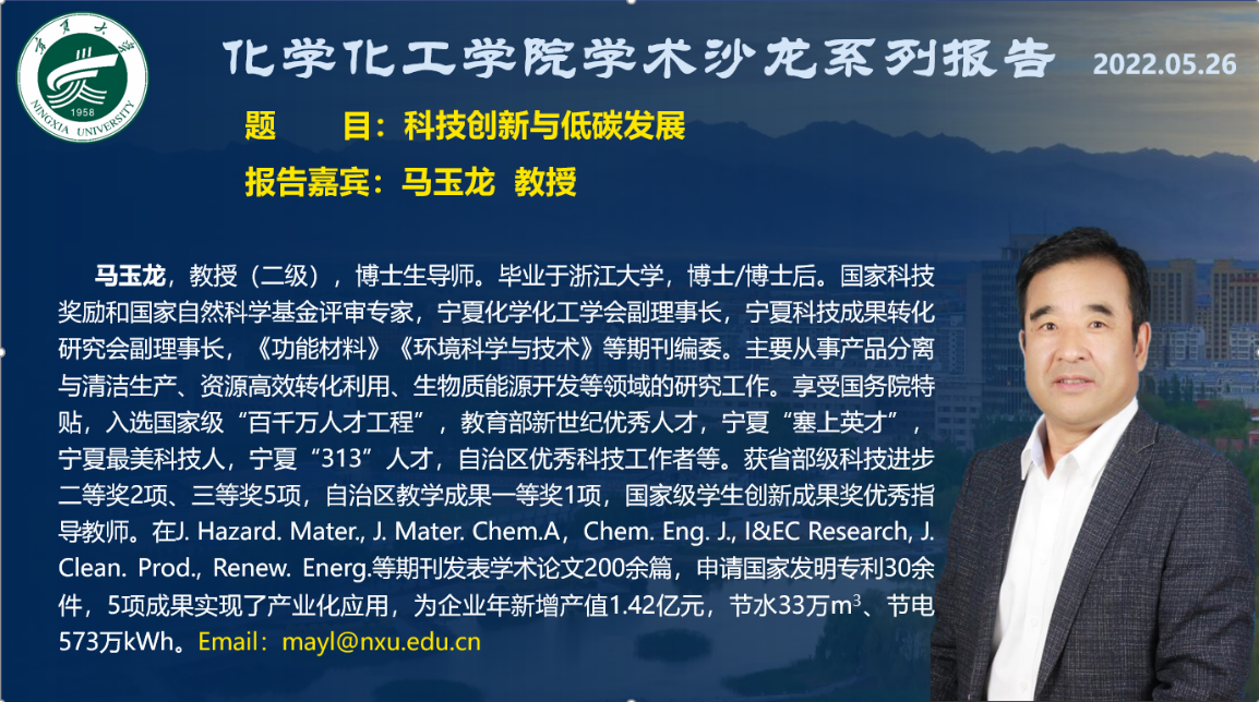 5月27日晚上7点,蘑菇视频 学术沙龙邀请教育部新世纪学术优秀人才、宁夏“塞上英才”、宁夏最美科技人获得者马玉龙教授做了题为“科技创新与低碳发展”的学术报告。学院部分老师及本科生、研究生参加了此次学术活动。