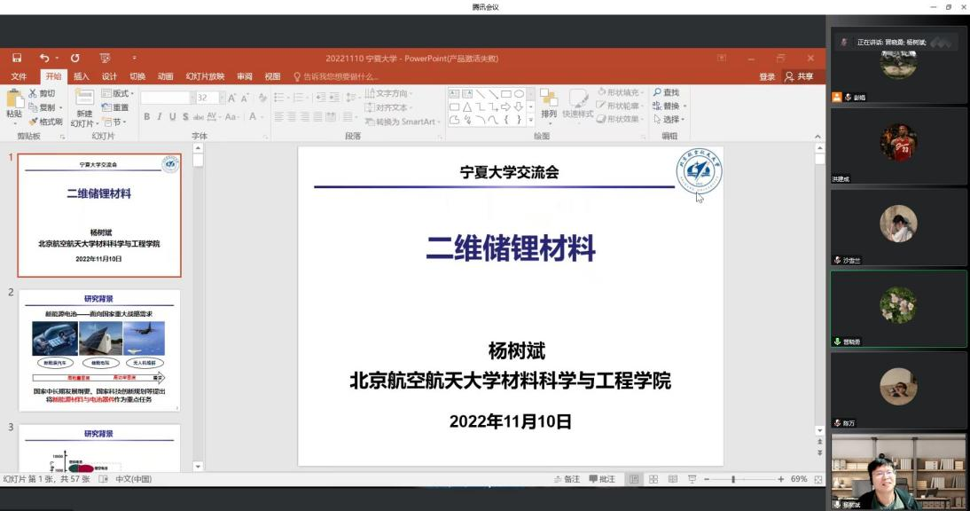 2022秋季系列学术报告会继续在线上举行。本次报告有幸邀请到国家杰出青年基金获得者,北京航空航天大学材料科学与工程学院杨树斌教授,杨教授做了以“二维储锂材料”为题的报告。学院师生100余人参加了此次报告。