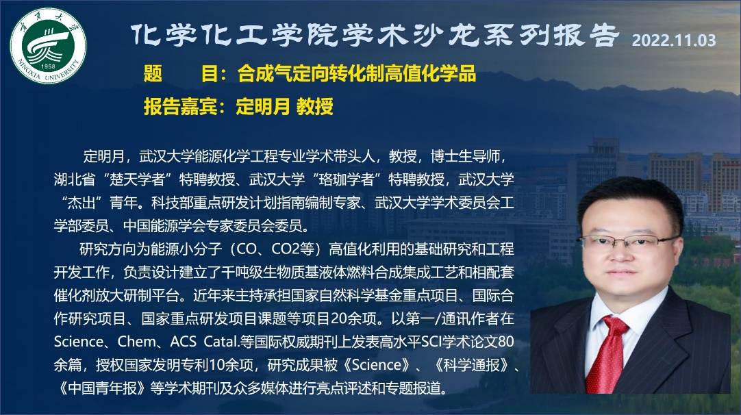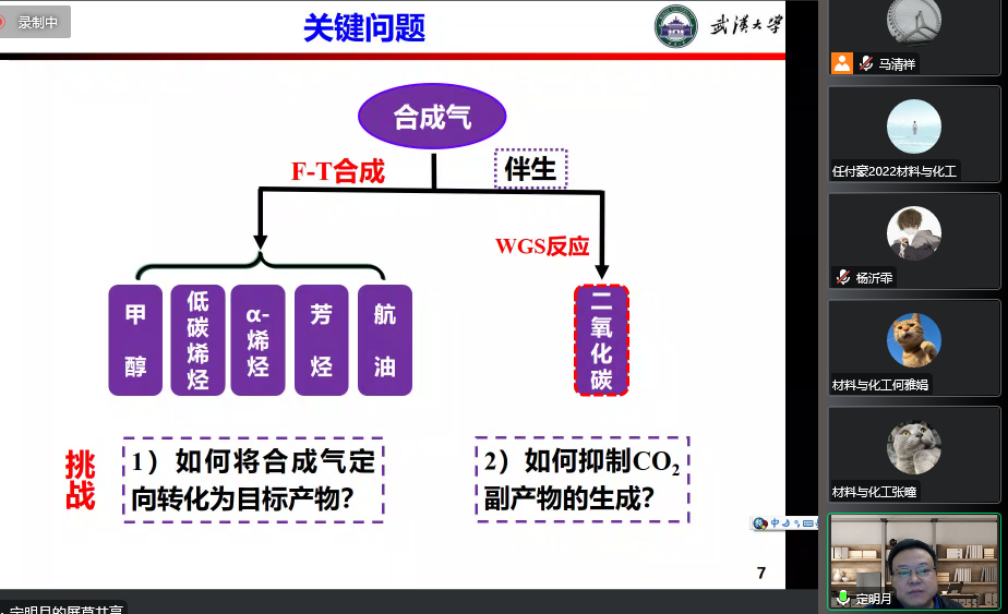2022年秋季第八次学术沙龙报告会在线上举行。湖北省“楚天学者”特聘教授、武汉大学“珞珈学者”特聘教授,武汉大学“杰出”青年、武汉大学能源化学工程专业学术带头人定明月教授做了题为“合成气定向转化制高值化学品”的报告。学院部分青年教师及研究生、本科生近200人参加了此次学术活动。报告会由化工系副主任马清祥研究员主持。