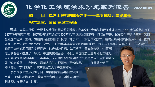 学术沙龙系列报告邀请宁夏宝立集团有限公司副总裁黄斌高级工程师为化工、应化等工科专业学生开展了题为“卓越工程师的成长之路——享受挑战,享受成长”的报告。