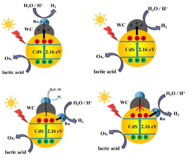 马保军研究员团队设计制备了(Ru/WC)/CdS和Ru/(WC/CdS)两种复合助催化剂。经过研究发现当贵金属Ru先行担载在非贵金属助催化剂WC上时,两者在光催化析氢反应中具有协同作用。而当贵金属Ru直接担载在复合催化剂WC/CdS上时,由于电子的转移路径改变,两种助催化剂对于电子的作用呈现出竞争关系,削弱了助催化剂的协同作用,Ru/(WC/CdS)的光催化活性反而劣于WC/CdS。该研究阐述了WC和Ru在光催化剂中的作用以及不同活性位点组成的复合催化剂的电子转移路径,为在半导体上组装高效的复合助催化剂奠定了坚实的基础。
