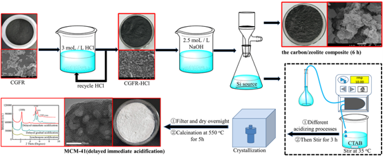 目前煤渣的资源化利用已成为煤炭和环境科学的核心问题。煤气化渣虽可转化为多孔材料,但对于这些材料的合成,不仅需要高温,且提取硅源后仍会产生新的固废。这就迫切需要探寻新的固废转化思路实现煤渣的综合利用。院室马玉龙教授团队开发了一种新的策略,可以在温和条件下从煤气化细渣(CGFR)分级合成高度有序的MCM-41和碳/沸石复合材料。通过分级制备方式,实现CGFR的有效转化和利用。合成的MCM-41不仅具有六边形和1D孔道高度有序特征,且具有大的比表面积(1013-1073 m2 g-1)和窄的孔径分布(3.5 nm);对于合成的碳/沸石复合材料具有在碳衬底上形成花状P型沸石的形貌特征,总比表面积189.27 m2 g-1。将合成的两种材料分别应用于有机废水的处理研究,对废水中有机污染物均显示出优良的吸附和去除效果。该成果论文 “Graded Synthesis of Highly Ordered MCM-41 and Carbon/Zeolite Composite from Coal Gasification Fine Residue for Crystal Violet Removal” 近期在国际著名期刊《Journal of Cleaner Production》上发表。论文第一作者是我校2018级水资源利用与化学化工专业博士研究生吴玉花,通讯作者是马玉龙教授。研究得到宁夏重点研发项目和“化学工程与技术”国家一流学科建设项目的资助。