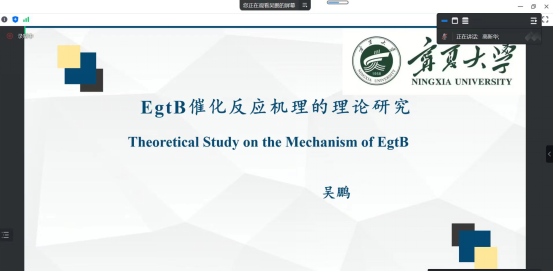 吴鹏博士以“EgtB催化反应机理的理论研究”为题作了报告,从理论基础的角度深入阐述了EgtB催化反应过程关键化学键的断裂和成键历程,对反应涉及到的质子转移和配体交换过程做了详细报告。