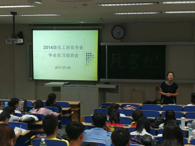 文萃校区1教221召开2018届化工及应化专业本科生毕业实习动员大会,化学工程与工艺专业88名同学、应用化学专业28名同学、教科办主任林枫、化工系主任李平及6位实习指导教师参加了实习动员大会。